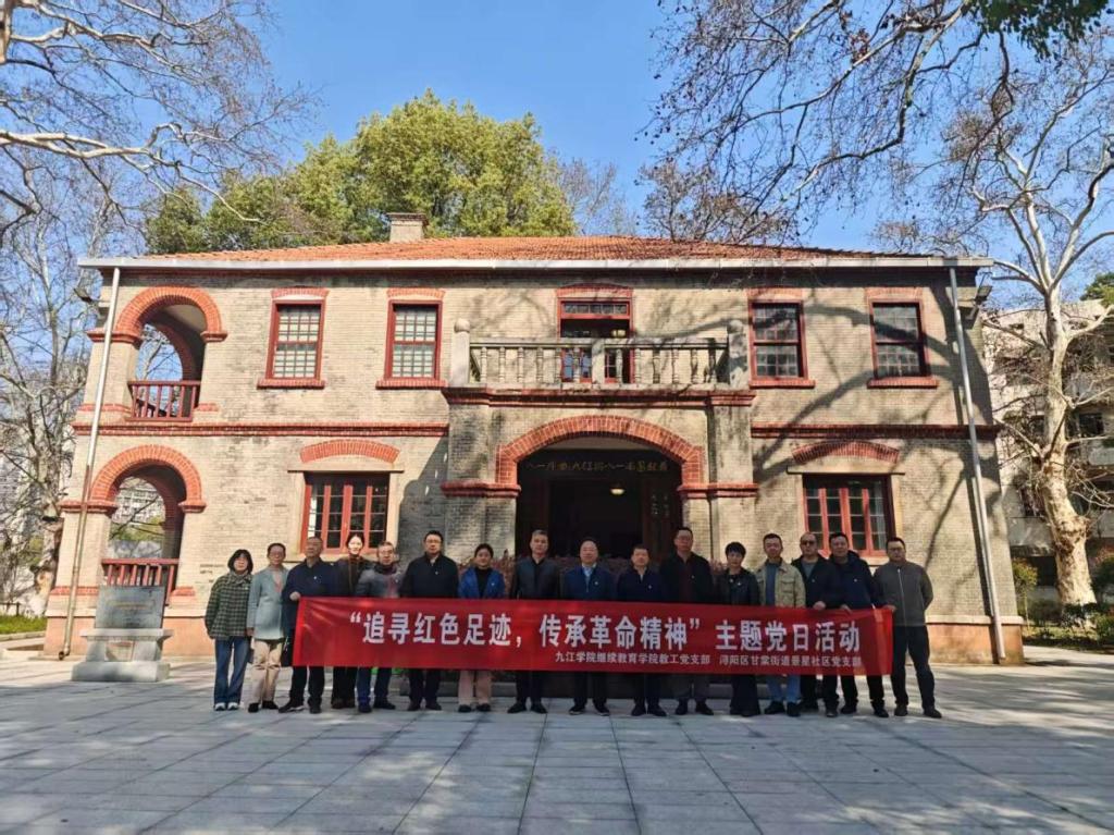 2025年3月19日,九江学院继续教育学院教工党支部与九江市浔阳区甘棠街道景星社区党支部联合开展了一场别开生面的主题党日活动。此次活动以“追寻红色足迹,传承革命精神”为主题,组织党员前往国民革命军第二十四师叶挺指挥部旧址参观学习,重温入党誓词,并探讨校地合作与党建共建等事宜。