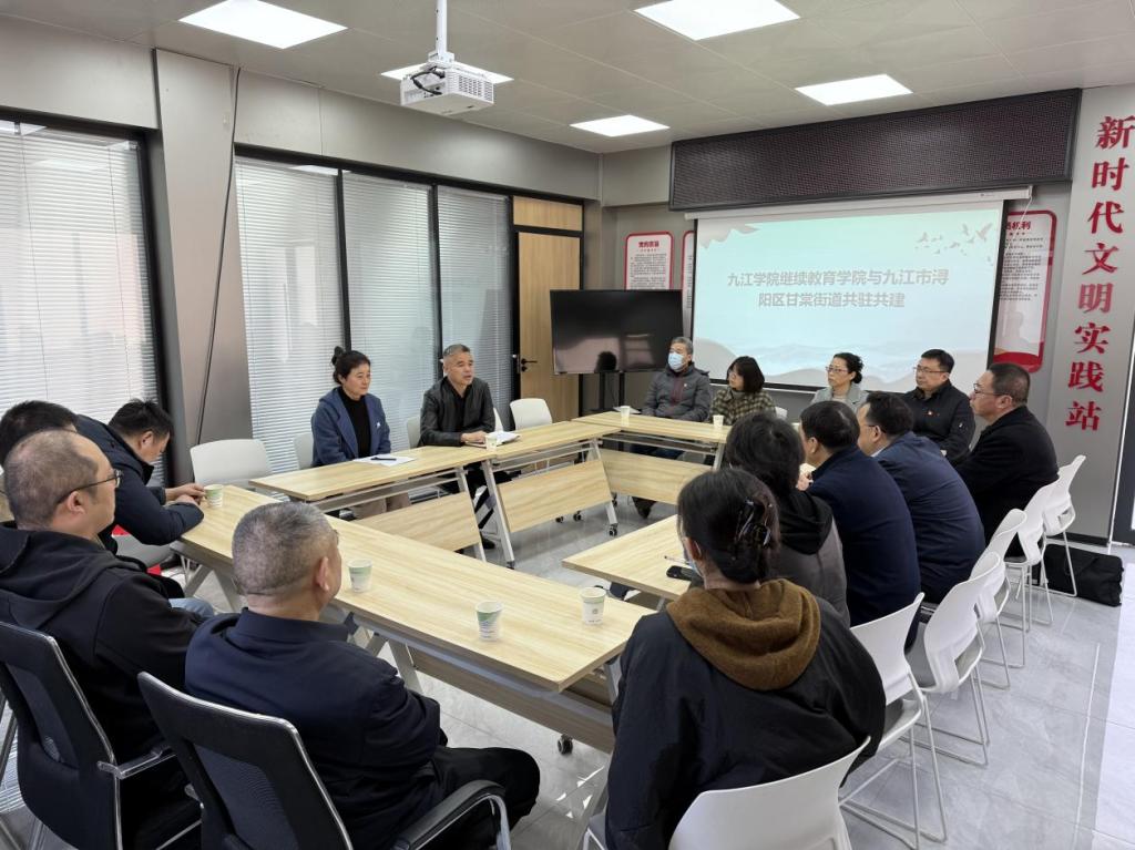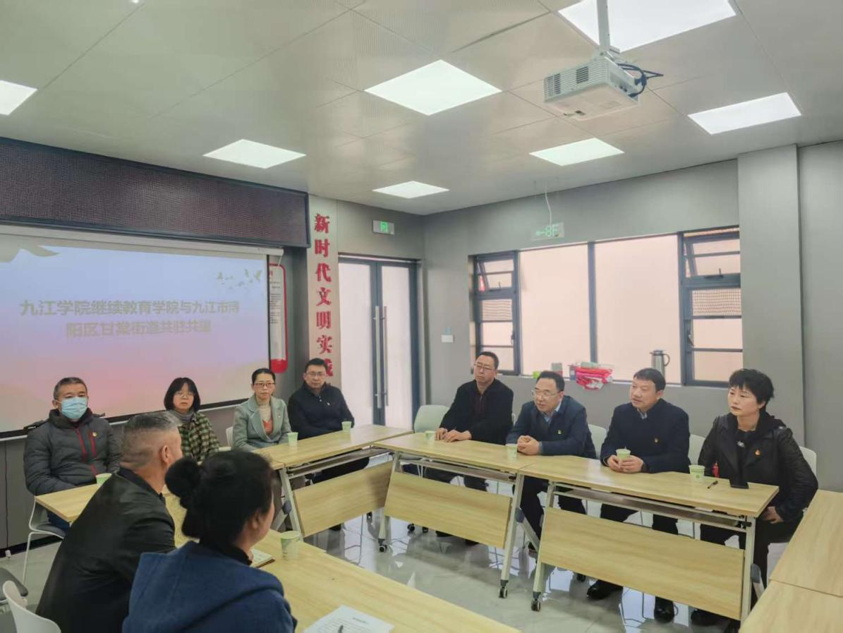 参观结束后,九江学院继续教育学院与甘棠街道围绕校地合作和党建共建进行了深入交流。九江学院继续教育学院院长郑祚双表示随着九江学院“3353”战略的实施,学院可以为辖区内的企业和职工提供职业技能培训、学历提升等项目,为地方经济社会发展提供人才支撑。同时,充分发挥高校资源优势,开展社区公益教育、文化讲座、科普宣传等活动,提升居民素质,丰富社区文化生活。