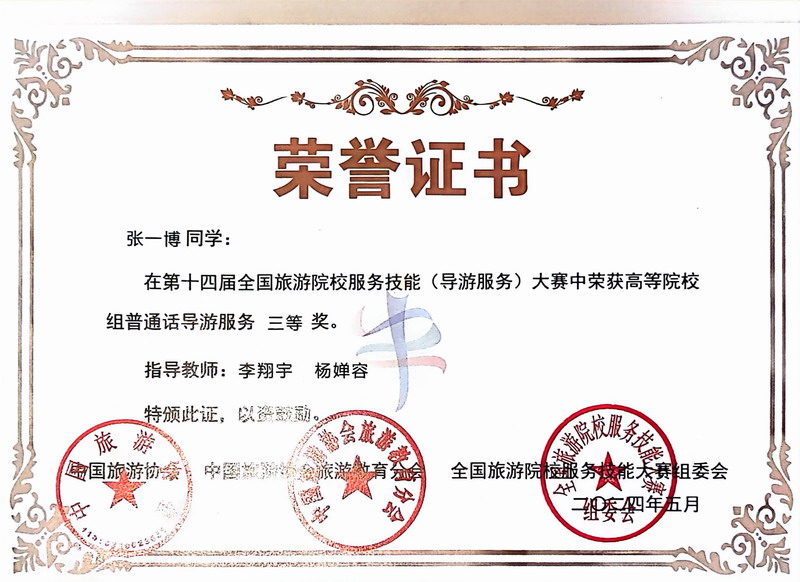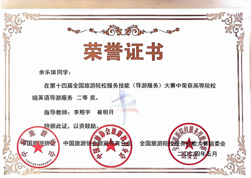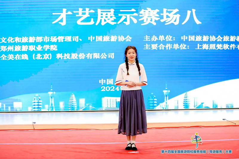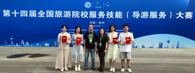 2024523日至26日,第十四届全国旅游院校服务技能(导游服务)大赛在河南郑州举行,旅游与地理学院选派了周颖、余乐琪、张一博、孙雪瑞4名学生分别参加了英语导游服务和普通话导游服务项目。经历激烈角逐,2022级旅游管理专业学生周颖、余乐琪分别夺得英文组赛项二等奖;2021级旅游管理专业学生张一博,2022级旅游管理专业学生孙雪瑞分别夺得普通话组赛项三等奖。