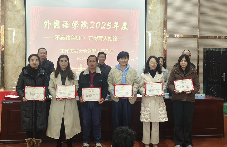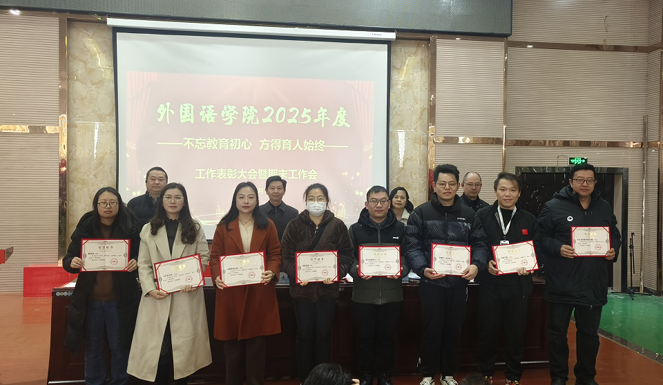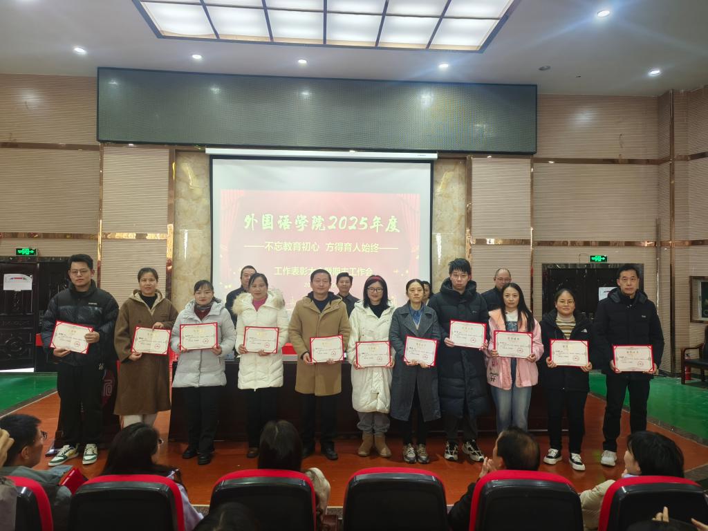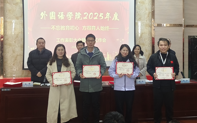 党委副书记江山宣读了《外国语学院关于2025年度工作表彰的决定》。大会对2025年度在教学、科研、学科建设、人才培养及社会服务等方面工作中取得突出成绩的个人和集体给予了表彰。院领导为获奖代表颁发了荣誉证书。