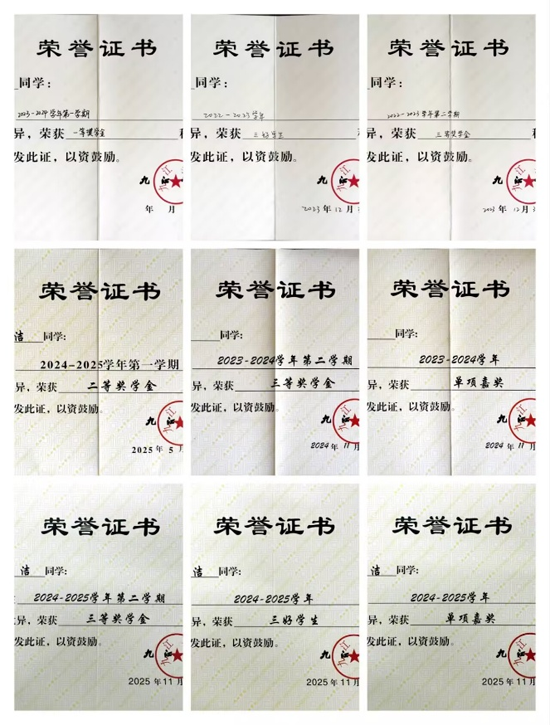 在学业与科研领域,向洁同学始终以“勤耕不辍”为座右铭,展现出计算机专业学子的钻研精神。大学期间多次荣获校“三好学生”荣誉称号,多次校级奖学金,“单项嘉奖”,还连续两年斩获国家励志奖学金。先后考取英语四、六级证书与计算机二级证书,筑牢专业知识根基。