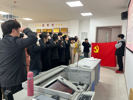 在新老党员入党宣誓环节,老党员同志庄重地为本学期新党员同志佩戴上党的徽章。一枚枚徽章在灯光下闪耀着金色的光芒,象征着责任的传承与使命的延续。之后,新老党员整齐列队,面向党旗,庄严地举起右拳,在领誓人的带领下,共同宣誓。激昂的誓言在会议室中回荡,每一个字都饱含着对党的忠诚与热爱,每一句话都彰显着为共产主义事业奋斗终身的坚定决心。