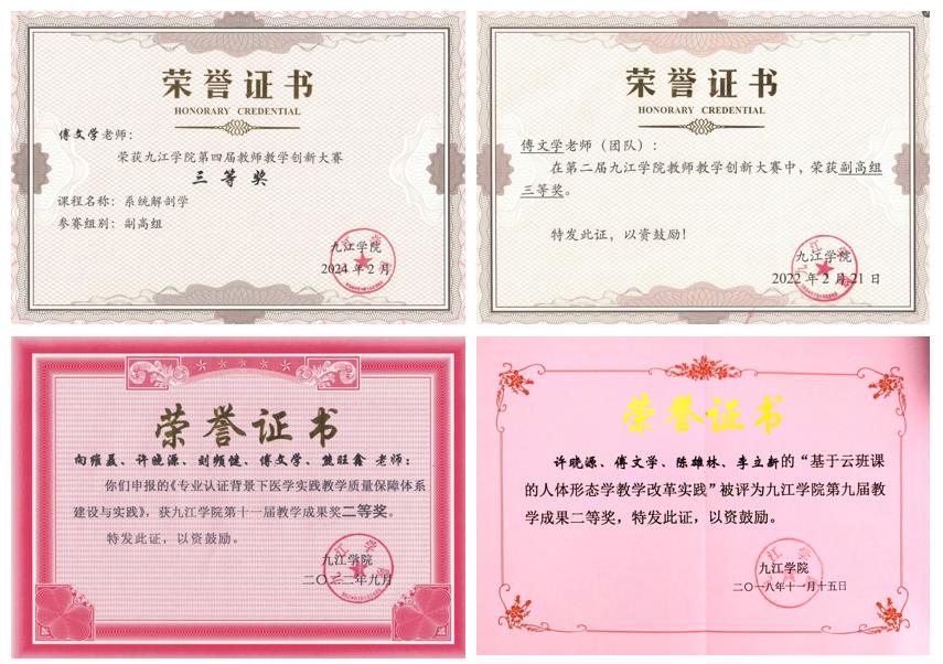 课程负责人傅文学副教授,九江学院基础医学院党委委员、中国解剖学会教育与继续教育分会委员、护理学分会委员、江西省解剖学会副理事长等学术职务。作为九江学院第二届“立德树人楷模”和首届“课程思政优秀教师”,他长期扎根解剖学教学科研一线,主持教育部“产学合作、协同育人”项目2项,主编教材4部、副主编5部,发表论文20余篇,荣获校教学成果奖2项,多次获评校级“优秀教师”、“教学标兵”、“优秀党务工作者”等荣誉。在他的带领下,一支兼具深厚学术功底、创新教学理念和奉献精神的教学团队逐渐成熟,成为课程高质量发展的核心引擎。