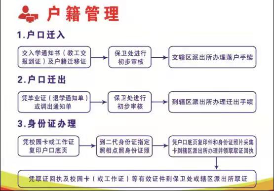 办理人员携带入学通知书(或入职报到证)及户籍迁移证到保卫处内勤科进行初步审核,再交至辖区派出所办理落户手续。