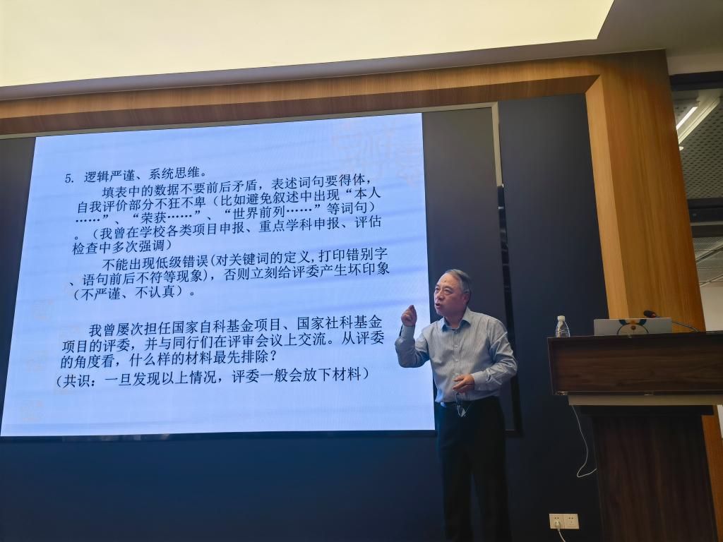 甘筱青从九江“山”、“江”、“湖”的人文地理优势切入,以习近平总书记2016年“七一”讲话为引言,谈到治学宗旨与理念。以他自1995年获清华大学应用数学博士以来承担的9个国家级科研基金项目为主线,梳理了对申报国家基金项目的思索,提出确定申报领域和题目应结合自身专业特色、区域特色、社会热点和自身研究经历;题目不宜过大,而要围绕内容“从小切入,小题大作”,注意新颖性;研究内容既要有先进性,又要从实际中来,做到“顶天立地”;研究队伍,搭配合理,可选择适当的合作单位;内容上要逻辑严谨、系统思维,要体现自身研究工作的“与众不同”之处;厚实团队基础,铺垫前期成果,精心打磨申报书。同时,他还分享了国家基金项目申报应注意的准则、细节和填报技巧。