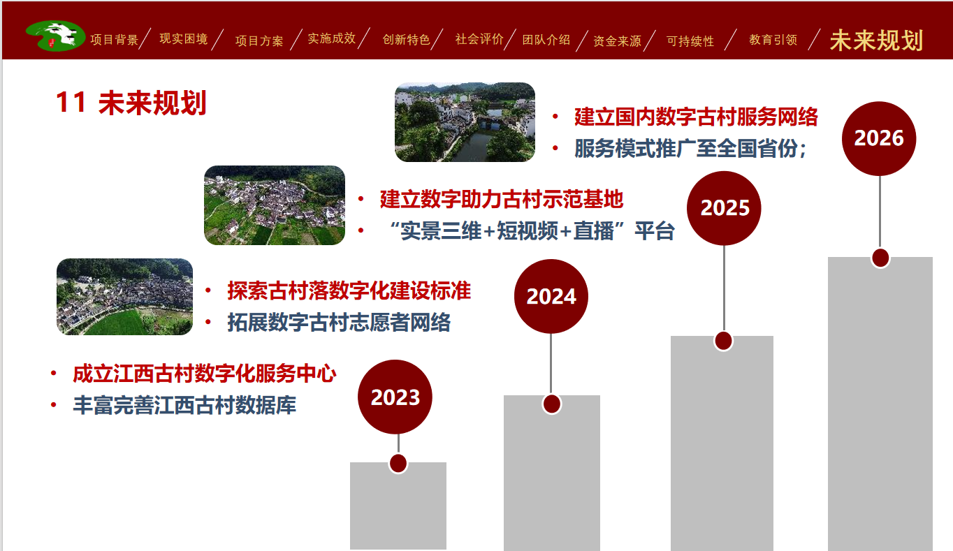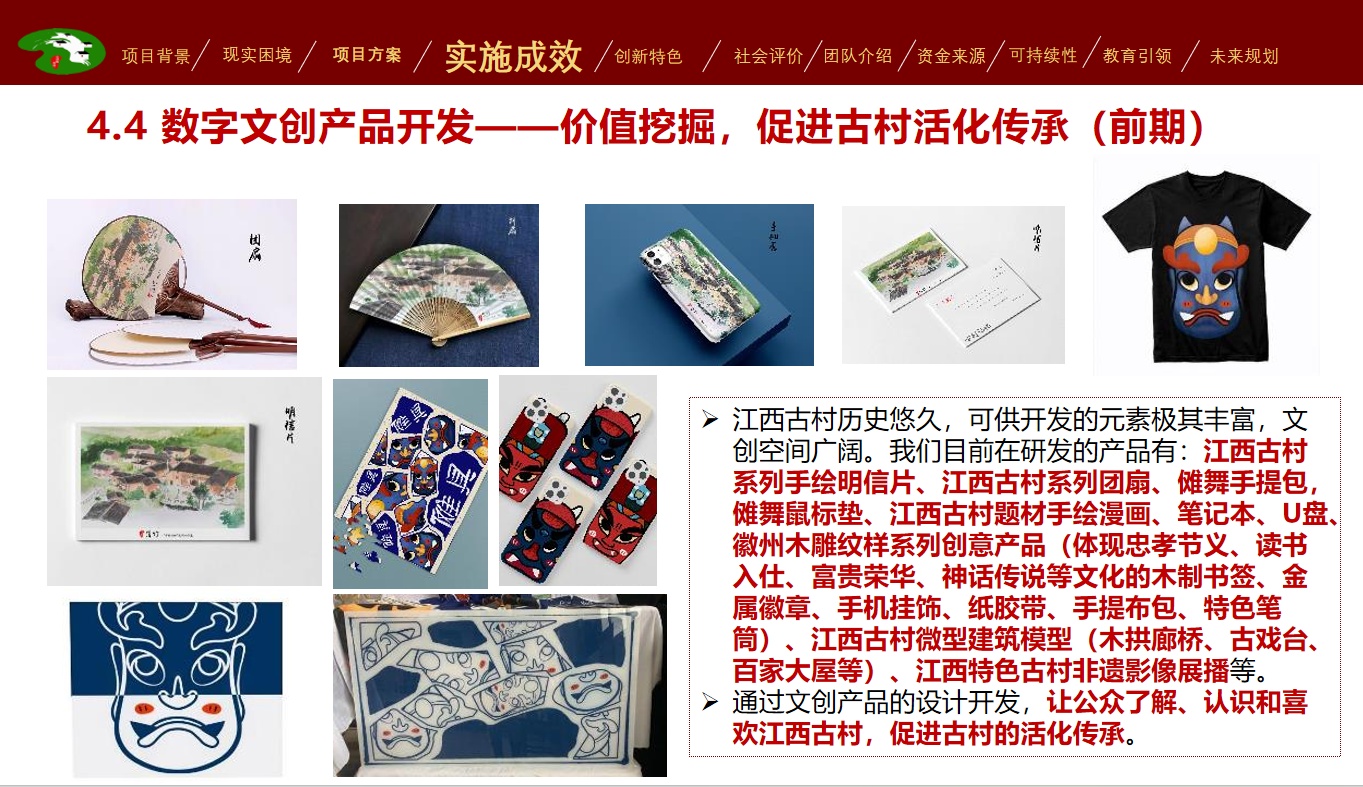 2017年,我们成立江西数字古村服务社团,启动“古网金来”项目,经过了8年的实地调研、资源整合和运营实践,我们探索构建了线上+线下赋能、四大举措和九大盈利机制的古村保护与价值创新模式,通过搭建平台整合资源,内容创新聚人引流,知识输出实现价值提升,文创激活促进传承发展。