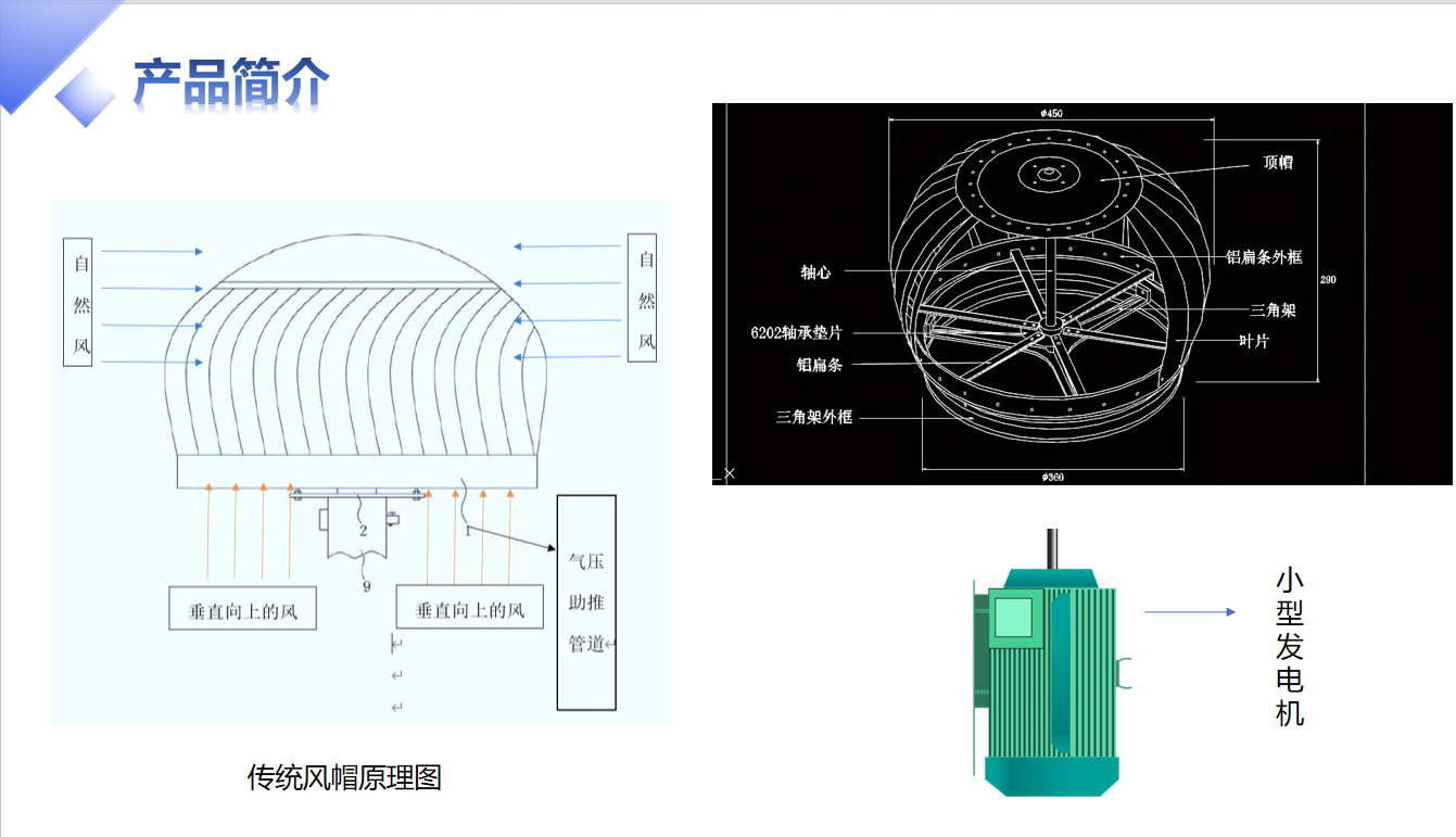项目主要产品和服务包括:风帽无动力发电装置,智能控制系统。风能是一种清洁无公害的可再生能源,风力发电机,需要三级以上的风力才能够发电,在海拔3000m以内,大约每10m高度差,大气压差有100Pa,经测试6层楼的高度气压差就可以达到三级风力,在城市中60%都是6层以上楼层,尤其最近几年所建楼房几乎全在6层以上,均可以实现风帽无动力发电。风帽无动力发电相对于太阳能发电、传统叶片风力发电,不受天气影响,整个发电过程可以不分日夜连续进行,更加稳定,不受温度、天气、气象风力影响,且完全零排放,有助于实现“双碳”目标。风帽无动力发电安装简单,造价低,经久耐用,便于维修,尤其对于城市亮化工程、安全监控、公共区域照明等方面具有广阔应用前景。