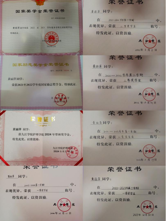黄丽萍,女,中共党员,系护理学院A2111班学生,曾担任护理学院团委宣传部部长。在校期间,她获评“勤奋学习标兵”“三好学生”“优秀学生干部”等荣誉称号,并连续7次获得各类奖学金,其中包括2022-2023学年国家奖学金以及2024年翠林奖学金。她曾先后斩获第八届九江学院“互联网+”大学生创新创业大赛优秀奖、第九届九江学院“互联网+”大学生创新创业大赛决赛暨省赛选拔赛铜奖、九江学院护理学院第九届“互联网+”大学生创新创业大赛二等奖、九江学院护理学院第十届“互联网+”大学生创新创业大赛一等奖等多项比赛奖项。不仅如此,她还积极参与志愿活动,传递着爱心和责任,连续两年参加护理学院暑期“三下乡”社会实践活动,荣获2023年度九江市大中专学生志愿者暑期文化科技卫生“三下乡”社会实践活动“先进个人”。