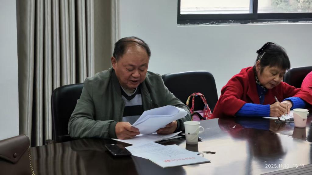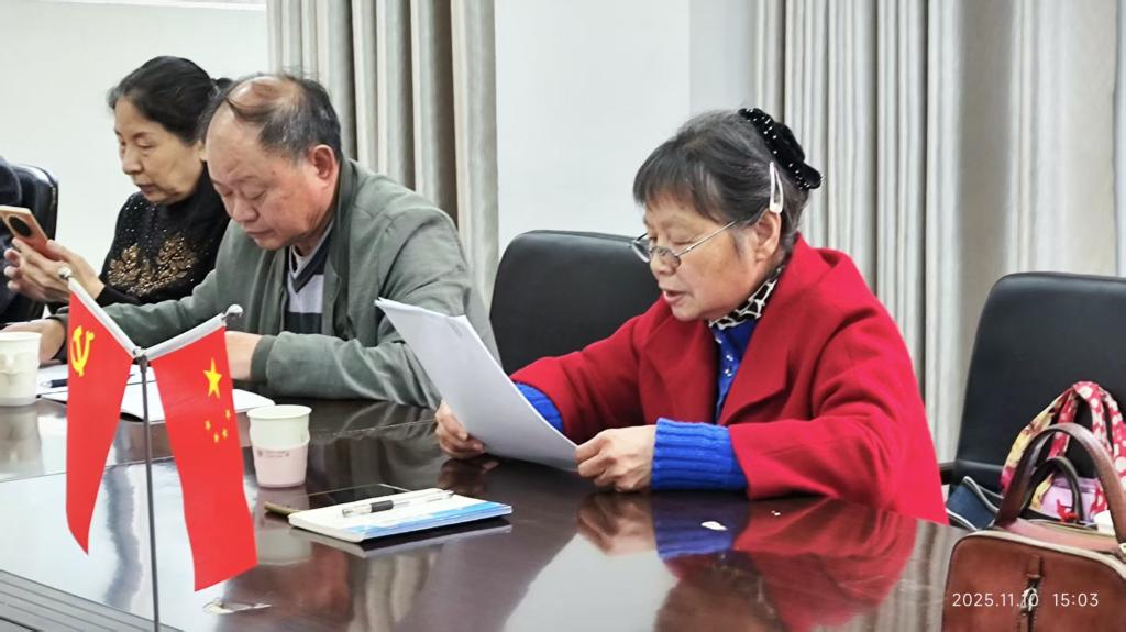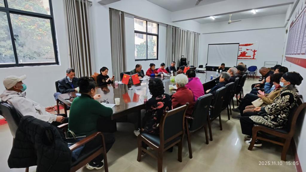 离退休党委第一、二党支部在学校离退休人员工作处二楼会议室联合召开专题学习会,在九江的老党员齐聚一堂,专题学习贯彻党的二十届四中全会精神,在深学细悟中凝聚思想共识,在交流研讨中激发银发奋进力量。会议由离退休党委委员、第二党支部书记周平松主持。